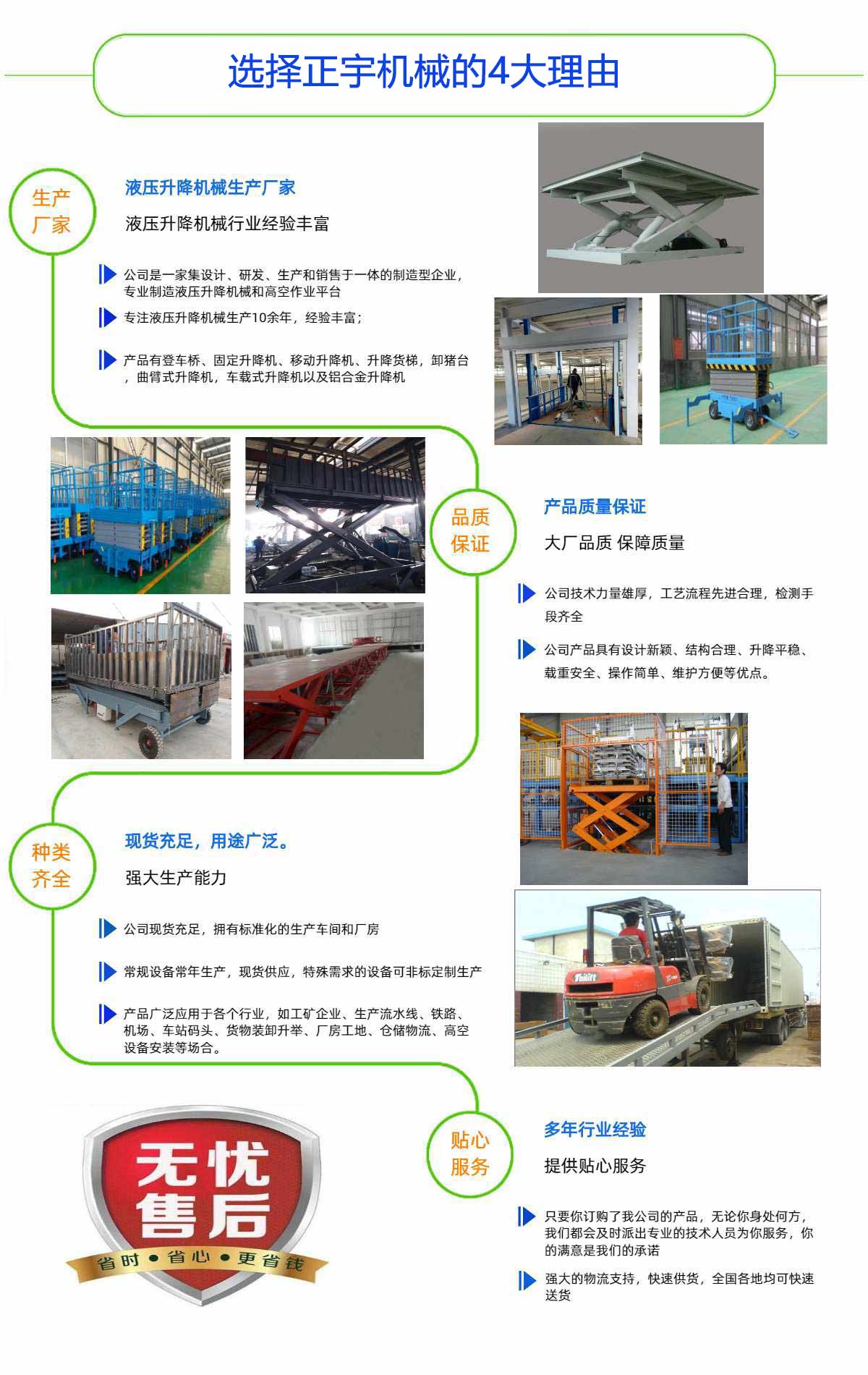濟(jì)南正宇升降機(jī)械有限公司是一家集設(shè)計、研發(fā)、生產(chǎn)和銷售于一體的制造型企業(yè),生產(chǎn)液壓升降機(jī)械和高空作業(yè)平臺,公司處于素有泉城美稱的山東省濟(jì)南市,坐落于濟(jì)北開發(fā)區(qū)。優(yōu)越的地理位置和便利的交通給公司的發(fā)展帶來了充分的條件。正宇液壓技術(shù)力量厚,工藝流程先進(jìn)合理,檢測手段齊全。目前主要產(chǎn)品有:高空作業(yè)平臺、登車橋、固定升降機(jī)、移動升降機(jī)以及鋁合金升降機(jī)等等。公司產(chǎn)品具有設(shè)計新穎、結(jié)構(gòu)合理、升降平穩(wěn)、載重安全、操作簡單、維護(hù)方便等優(yōu)點(diǎn)。產(chǎn)品廣泛應(yīng)用于各個行業(yè),如工礦企業(yè)、生產(chǎn)流水線、鐵路、機(jī)場、車站碼頭、貨物裝卸升舉、廠房工地、倉儲物流、高空設(shè)備安裝等場合。公司以誠信、創(chuàng)新、穩(wěn)健為宗旨,以品質(zhì)、完善服務(wù)的理念,迎接市場的挑戰(zhàn)。期待您的咨詢!